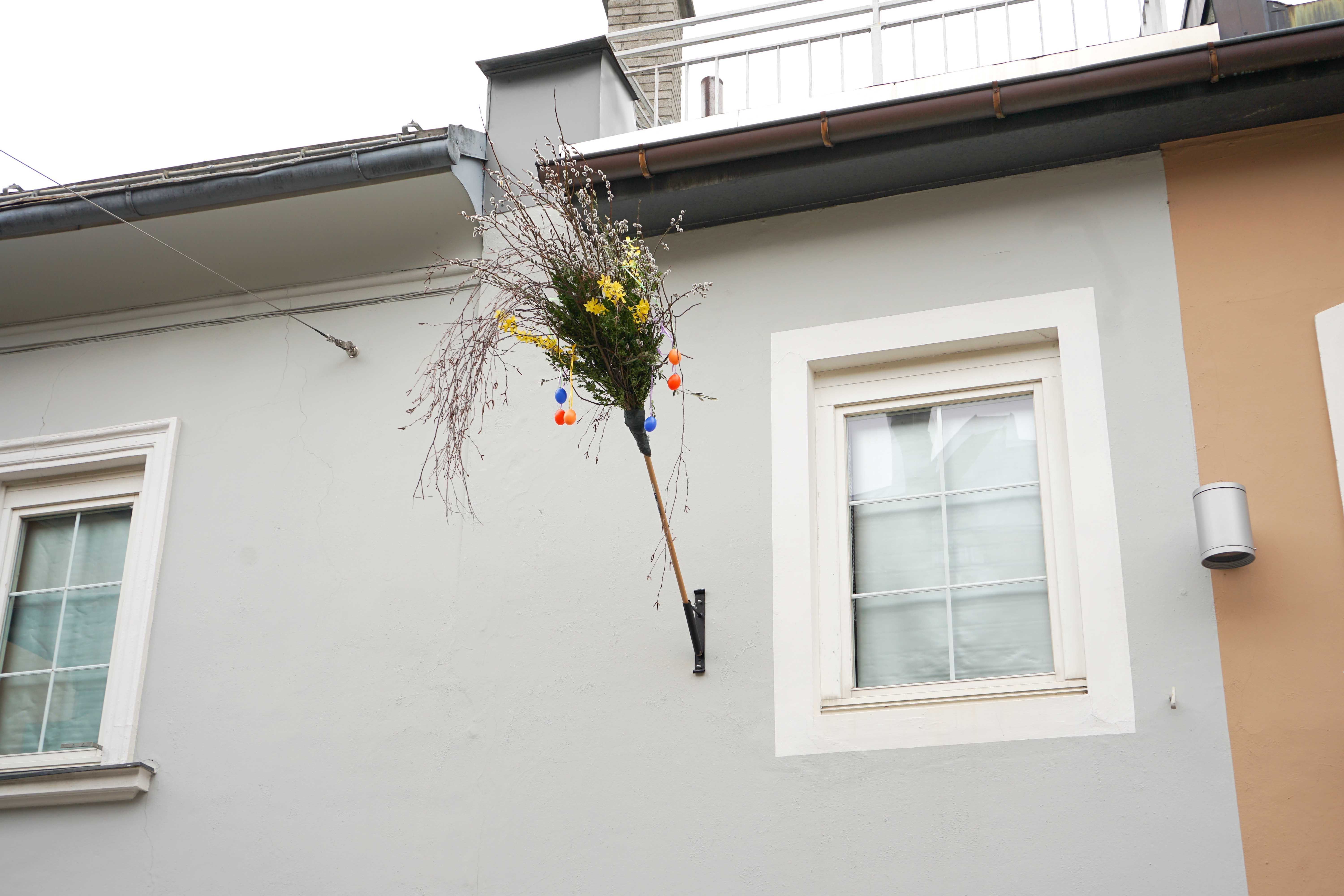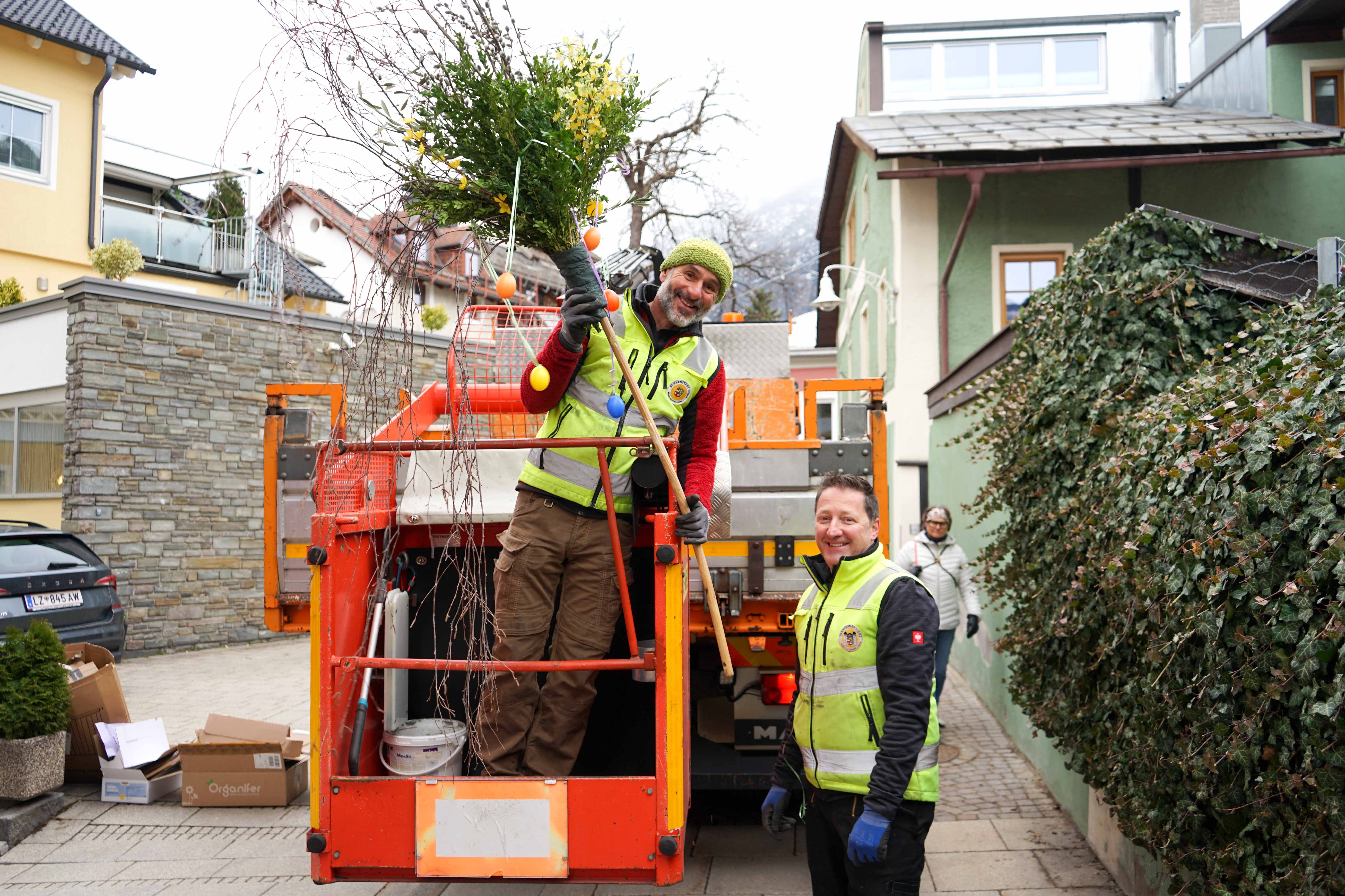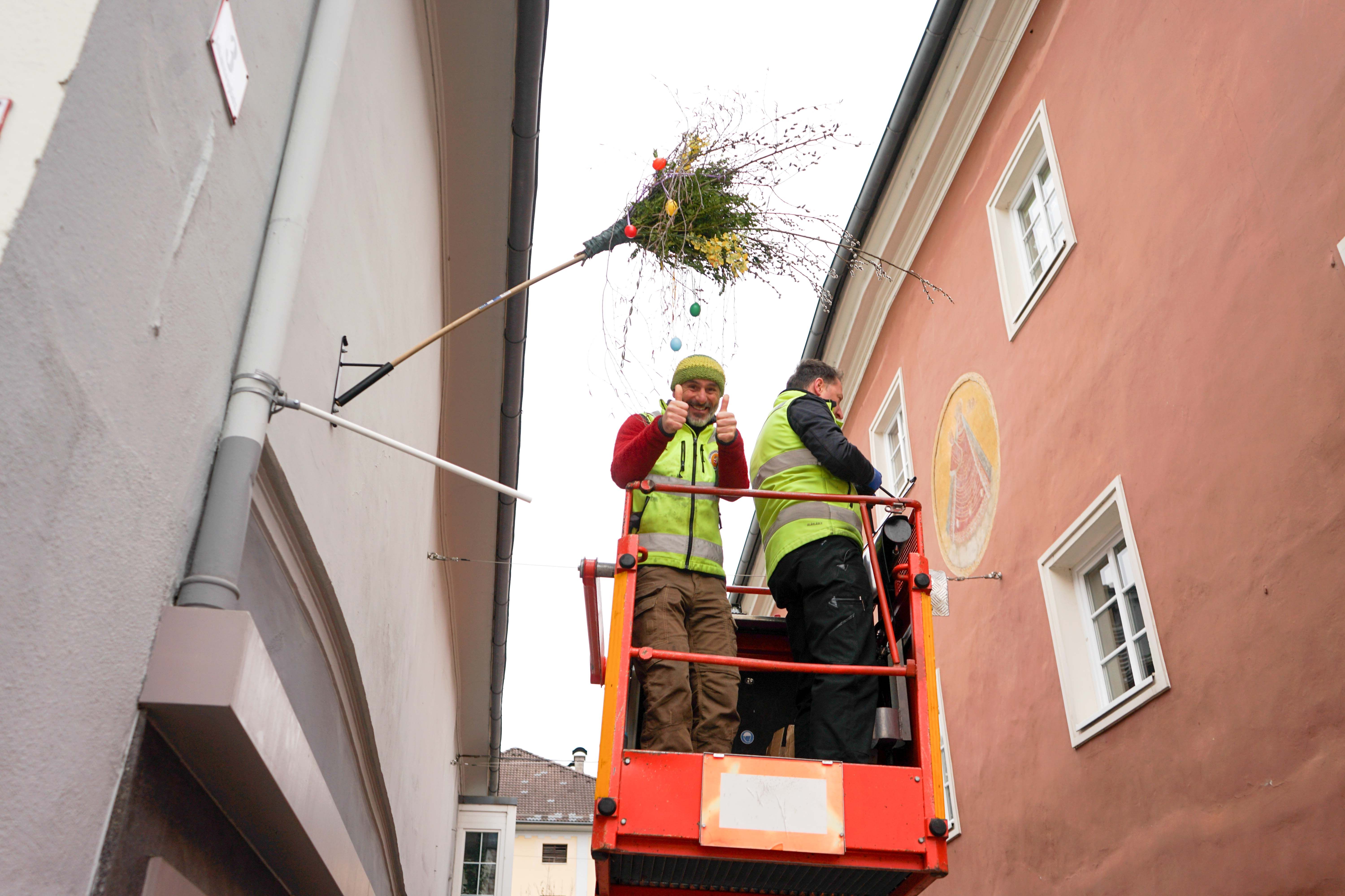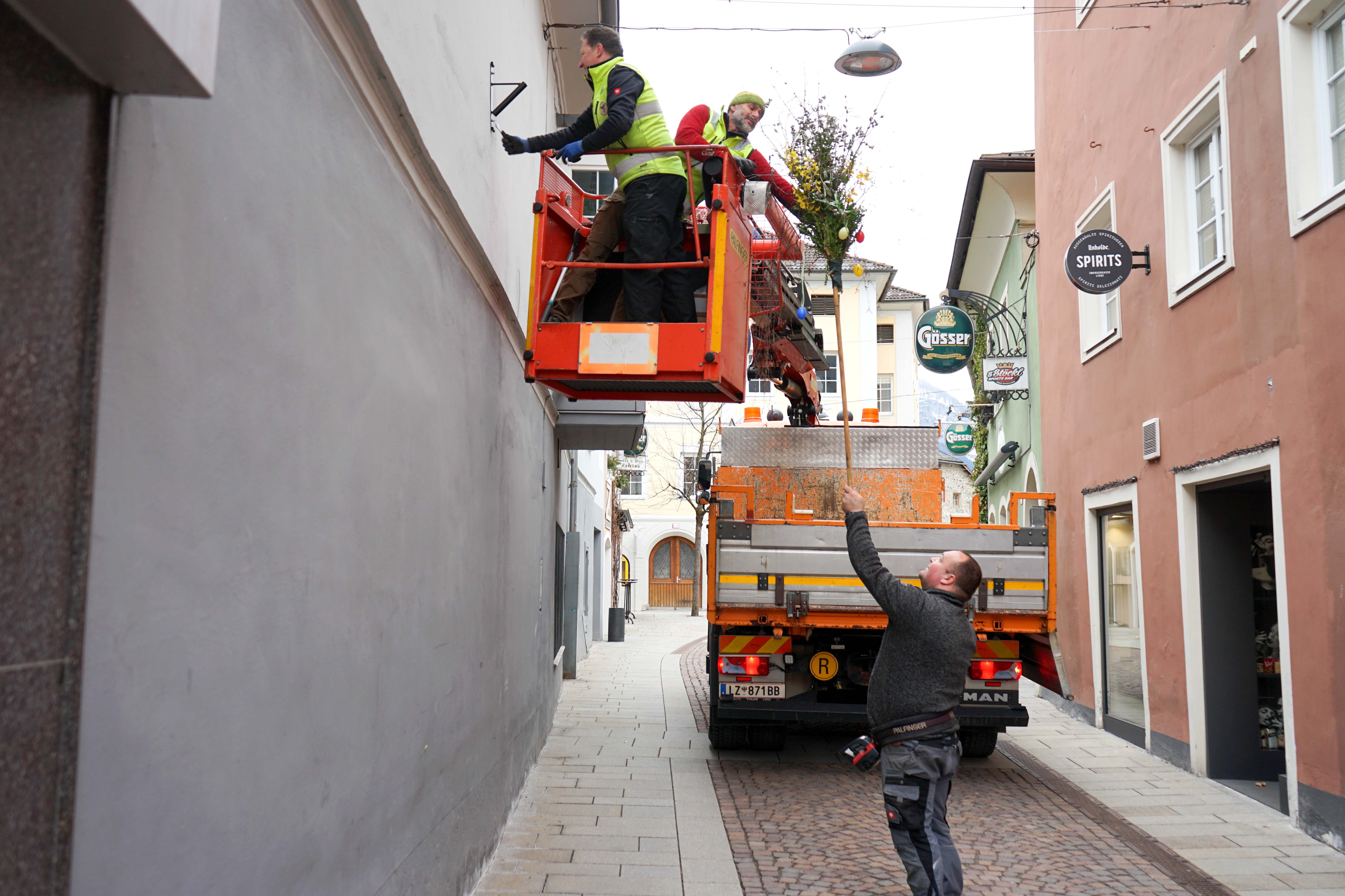 Farbenfroh und symbolträchtig präsentieren sich auch heuer wieder während der Ostertage die Messing- und Kreuzgasse sowie die Zwergergasse in Lienz. In liebevoller Kleinarbeit fertigten die Klienten der Werkstätte der Lebenshilfe Osttirol 27 Palmbesen aus Palmzweigen, Buchs, Birkenweiden und Ölzweigen an. Mit bunten Ostereiern dekoriert, sorgen diese nun bis Mitte April für ein stimmungsvolles Erscheinungsbild.