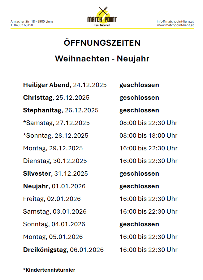 Öffnungszeiten des Café Match Point während der Weihnachtsfeiertage
